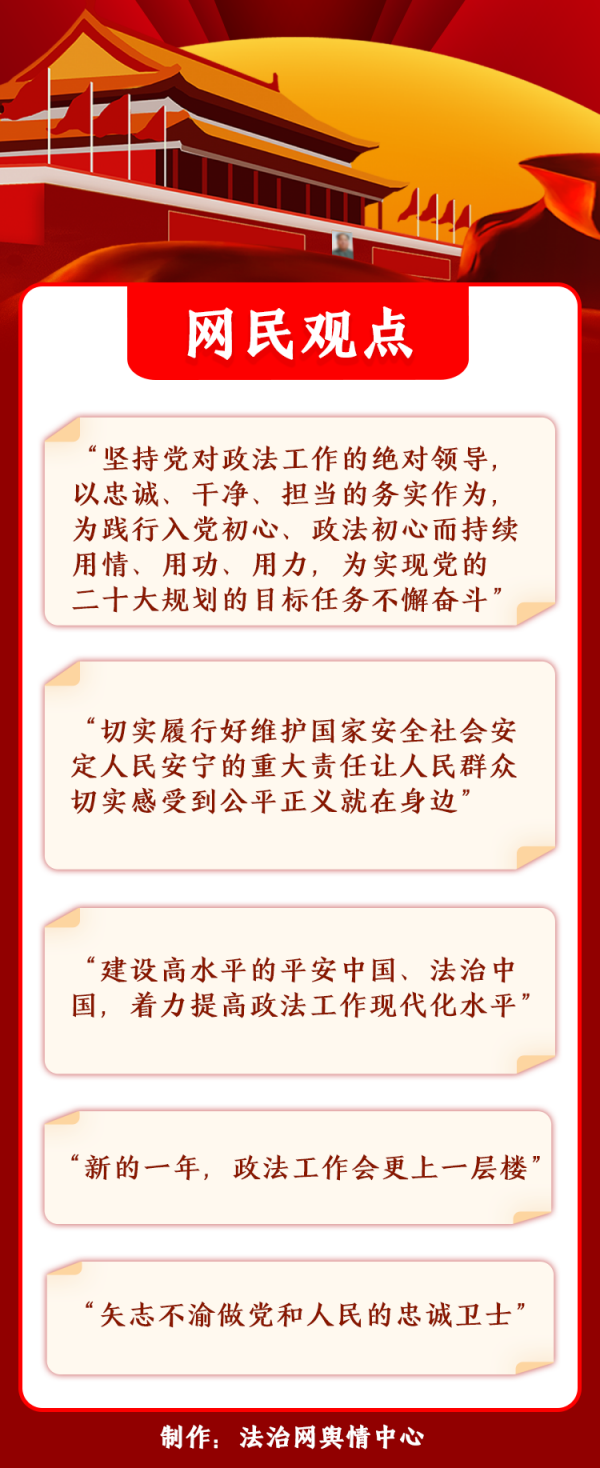 網(wǎng)民期待開啟新時代政法工作發(fā)展新篇章。不少網(wǎng)民在“中央政法委長安劍”等政法機(jī)關(guān)官微留言,認(rèn)為會議對政法工作的重要部署句句關(guān)于公正、深入人心。多數(shù)網(wǎng)民對全國政法機(jī)關(guān)有效維護(hù)國家安全、社會安定、人民安寧的付出表示感謝,期待推進(jìn)建設(shè)更高水平的平安中國、法治中國;部分網(wǎng)民向守護(hù)公平正義、維護(hù)社會穩(wěn)定而犧牲的政法干警致敬;少數(shù)網(wǎng)民結(jié)合政法系統(tǒng)違紀(jì)違法典型案例,呼吁在從嚴(yán)正風(fēng)肅紀(jì)上緊抓不放,建設(shè)高素質(zhì)政法鐵軍。
