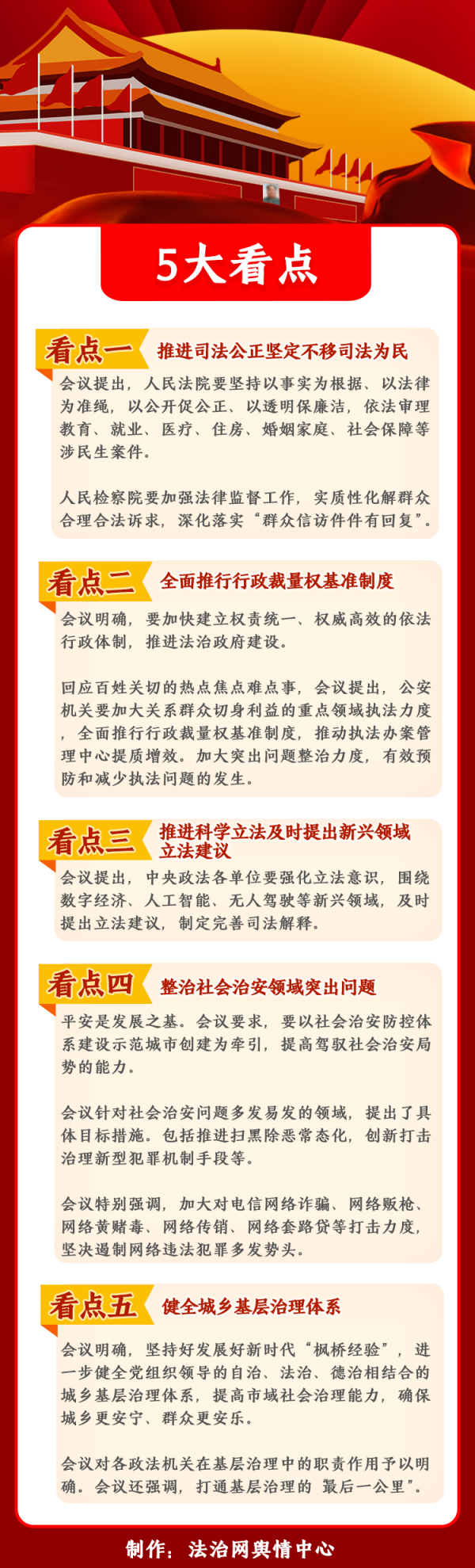 根據(jù)新華網(wǎng)發(fā)布的文章,本次會議聚焦2023年政法工作五大看點(diǎn):推進(jìn)公正司法,堅(jiān)定不移司法為民;全面推行行政裁量權(quán)基準(zhǔn)制度;推進(jìn)科學(xué)立法及時提出新興領(lǐng)域立法建議;整治社會治安領(lǐng)域突出問題;健全城鄉(xiāng)基層治理體系。