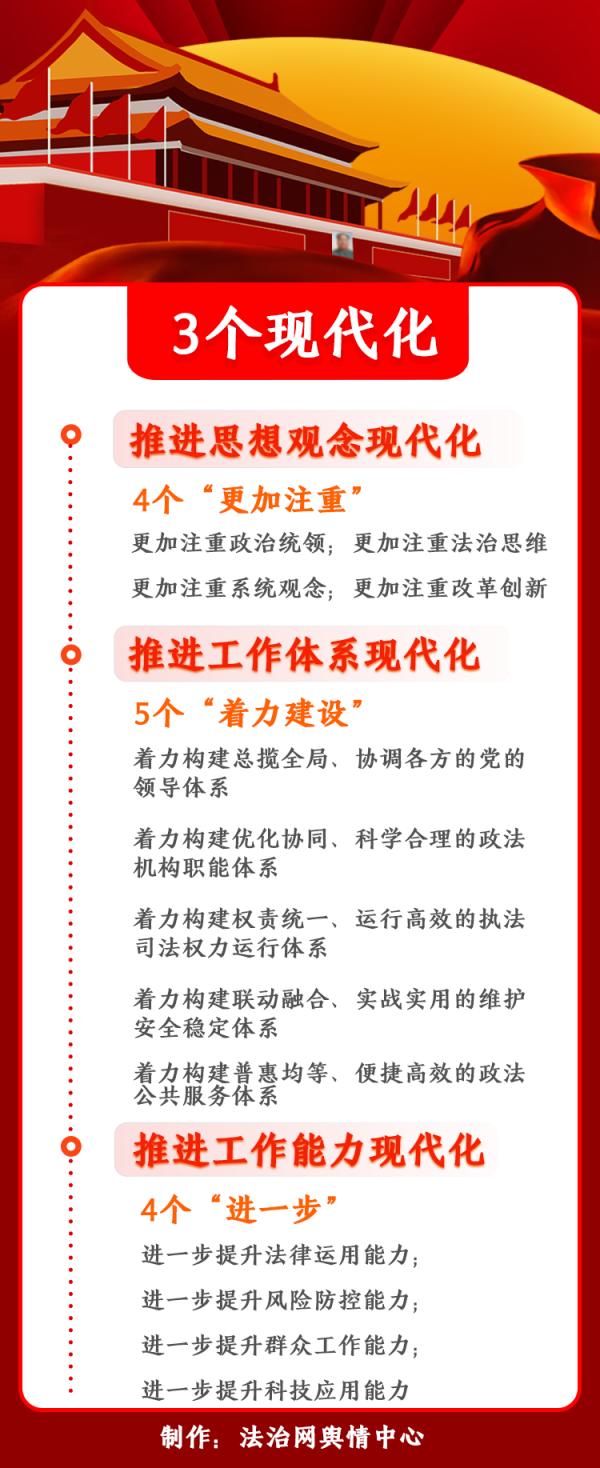 據(jù)法治網(wǎng)報道,本次會議提出要推進(jìn)政法工作三個現(xiàn)代化:推進(jìn)思想觀念現(xiàn)代化;推進(jìn)工作體系現(xiàn)代化;推進(jìn)工作能力現(xiàn)代化。