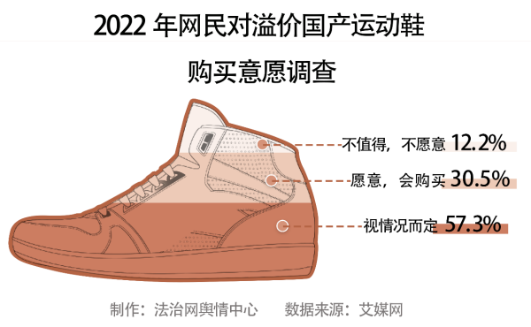 從艾媒網(wǎng)公布的數(shù)據(jù)來看,30.5%的消費者表示,無論國產(chǎn)運動鞋溢價多少都愿意購買,57.3%的消費者稱會視溢價情況而定,12.2%的消費者表示不會購買國產(chǎn)溢價運動鞋。
