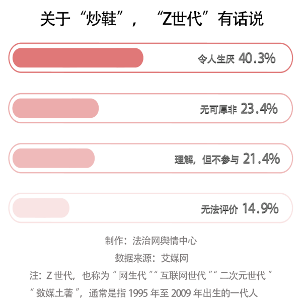 從艾媒網(wǎng)發(fā)布的數(shù)據(jù)來看,40.3%的“Z世代”(通常是指1995年至2009年伴隨著互聯(lián)網(wǎng)出生的一代人)厭惡“炒鞋”這一行為,23.4%的“Z世代”則認(rèn)為“炒鞋”無可厚非。
