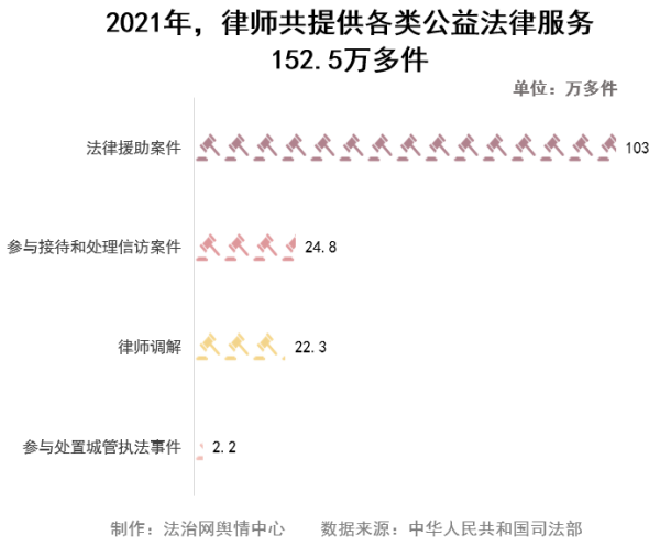 2021年,律師共提供各類公益法律服務(wù)152.5萬(wàn)多件,其中辦理法律援助案件103萬(wàn)多件,參與接待和處理信訪案件24.8萬(wàn)多件,律師調(diào)解22.3萬(wàn)多件,參與處置城管執(zhí)法事件2.2萬(wàn)多件。