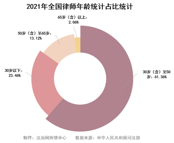 從年齡結(jié)構(gòu)來(lái)看,律師行業(yè)處于老中青共存階段。其中,30歲-50歲律師占比最高,達(dá)61.36%,30歲以下律師占比達(dá)23.46%,律師隊(duì)伍年輕化趨勢(shì)明顯。