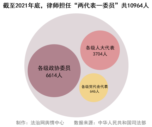 截至2021年底,律師擔(dān)任“兩代表一委員”共10964人,其中擔(dān)任各級(jí)人大代表3704人,擔(dān)任各級(jí)政協(xié)委員6614人,擔(dān)任各級(jí)黨代會(huì)代表646人。律師充分發(fā)揮職能優(yōu)勢(shì),在全面依法治國(guó)中積極作為、履職盡責(zé)。