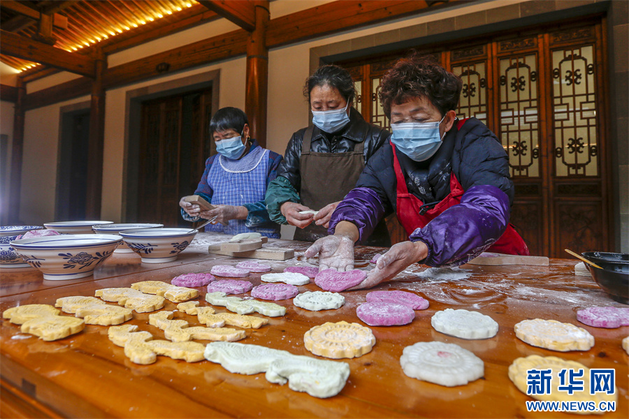 1月18日,在安徽省黃山市徽州區(qū)潛口鎮(zhèn)潛口村,村民在制作多彩徽州米粿。