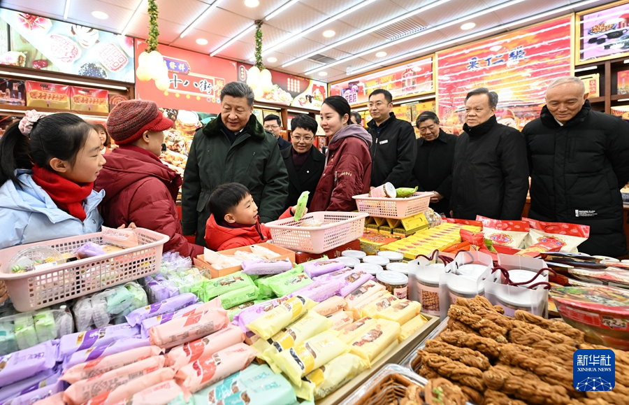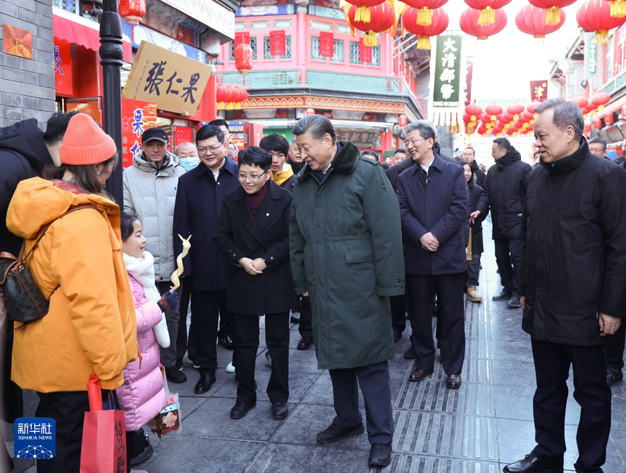 當(dāng)天下午,習(xí)近平來到天津古文化街。街道古色古香,習(xí)近平沿街步行,先后走進(jìn)桂發(fā)祥十八街麻花、果仁張、泥人張、楊柳青年畫等特色店鋪,了解產(chǎn)品種類、銷售和傳統(tǒng)文化傳承發(fā)展等情況,同店鋪業(yè)主、員工和現(xiàn)場群眾互動交流。他說,各級黨委和政府要加強(qiáng)節(jié)日期間民生商品的產(chǎn)銷保供,確保數(shù)量充足、品類豐富、質(zhì)量可靠,讓廣大群眾放心消費(fèi)、快樂過年。習(xí)近平指出,中國式現(xiàn)代化離不開優(yōu)秀傳統(tǒng)文化的繼承和弘揚(yáng),天津是一座很有特色和韻味的城市,要保護(hù)和利用好歷史文化街區(qū),使其在現(xiàn)代化大都市建設(shè)中綻放異彩。