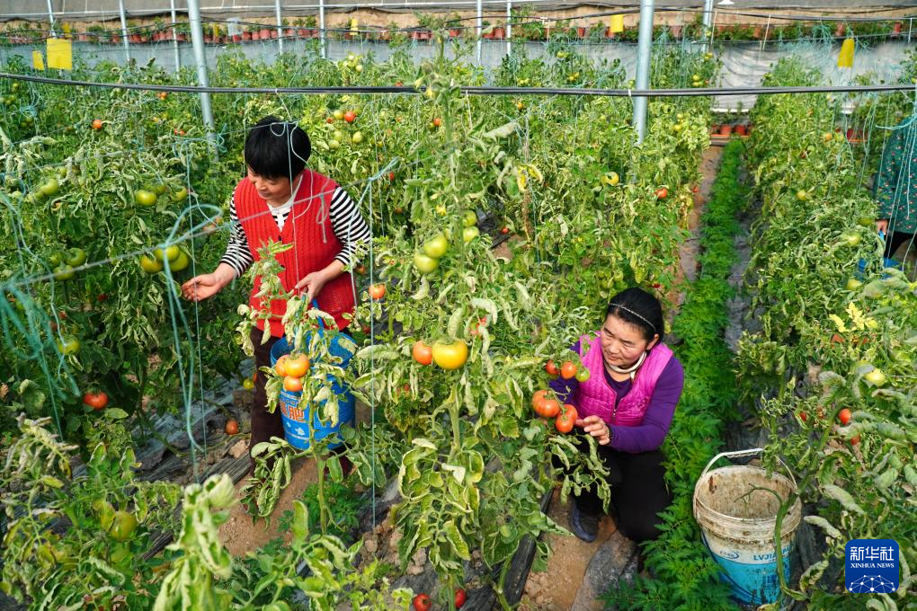 2月6日,在山東省臨邑縣臨南鎮(zhèn),蔬菜大棚種植戶在收獲西紅柿。