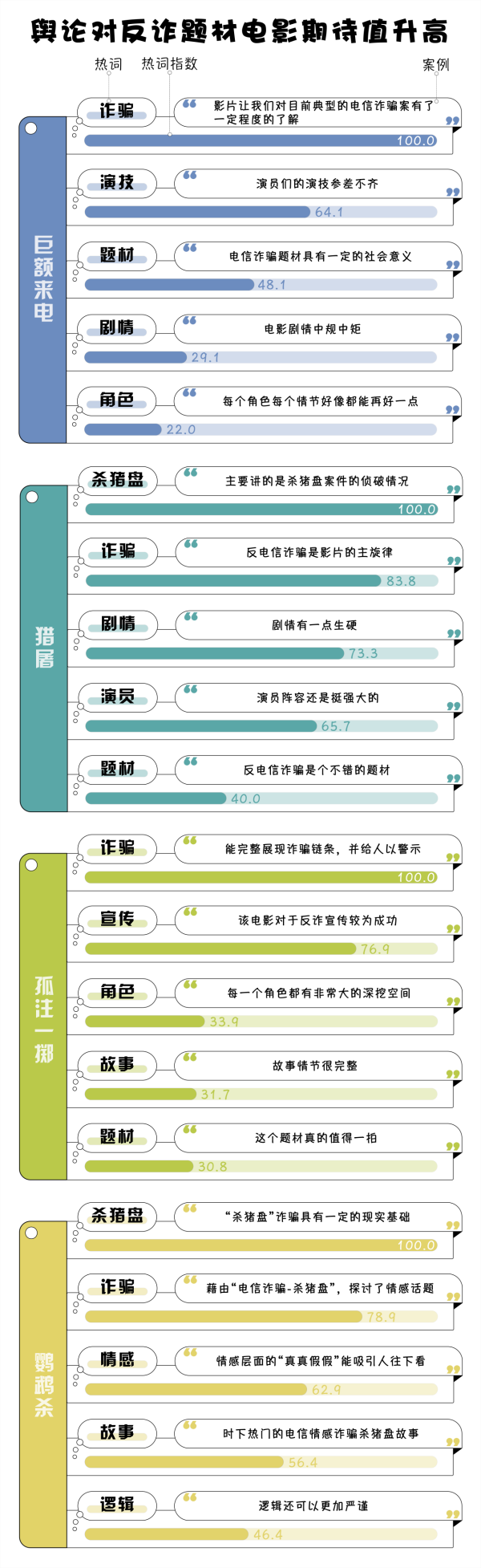 (制作:法治網(wǎng)輿情中心 數(shù)據(jù)來源:豆瓣 注:選取《巨額來電》《獵屠》《孤注一擲》《鸚鵡殺》等四部電影的部分豆瓣短評,對所選取的短評做分詞處理,將頻度最高的詞語規(guī)定為100,對熱詞做歸一化處理)