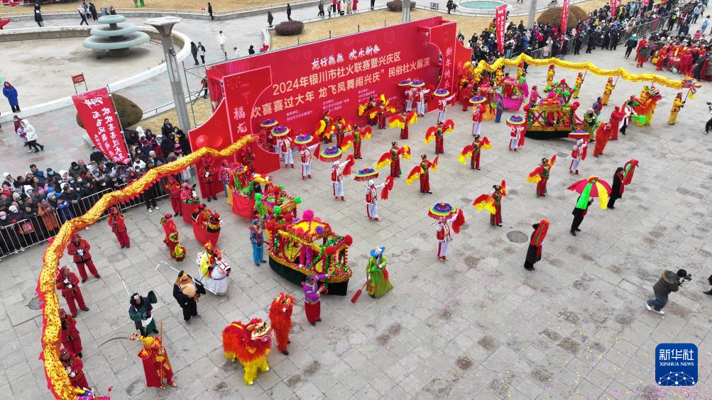 2月20日,在寧夏銀川市,參賽社火隊的演員為市民表演傳統(tǒng)社火項目(無人機照片)。
