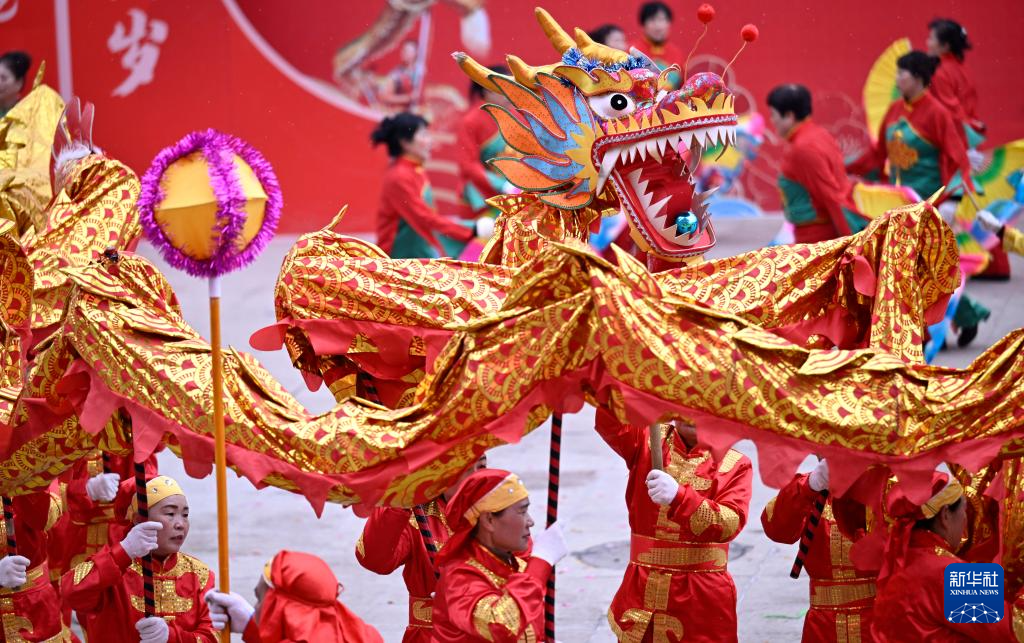 2月20日,在寧夏銀川市,參賽社火隊(duì)的演員為市民表演舞龍。