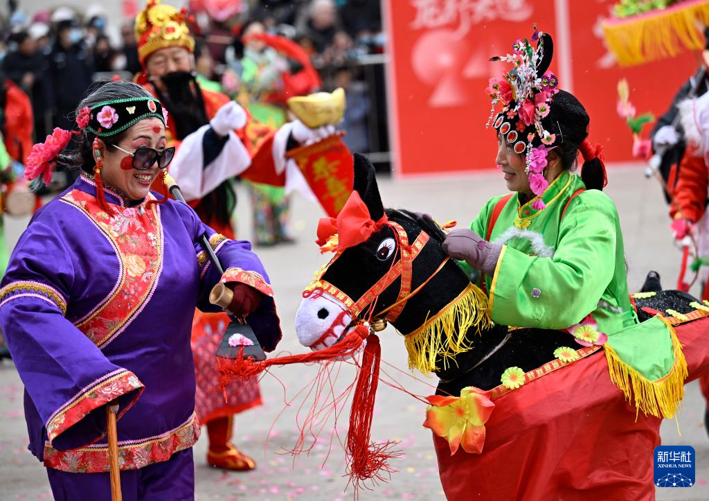2月20日,在寧夏銀川市,參賽社火隊(duì)的演員表演傳統(tǒng)社火項(xiàng)目。