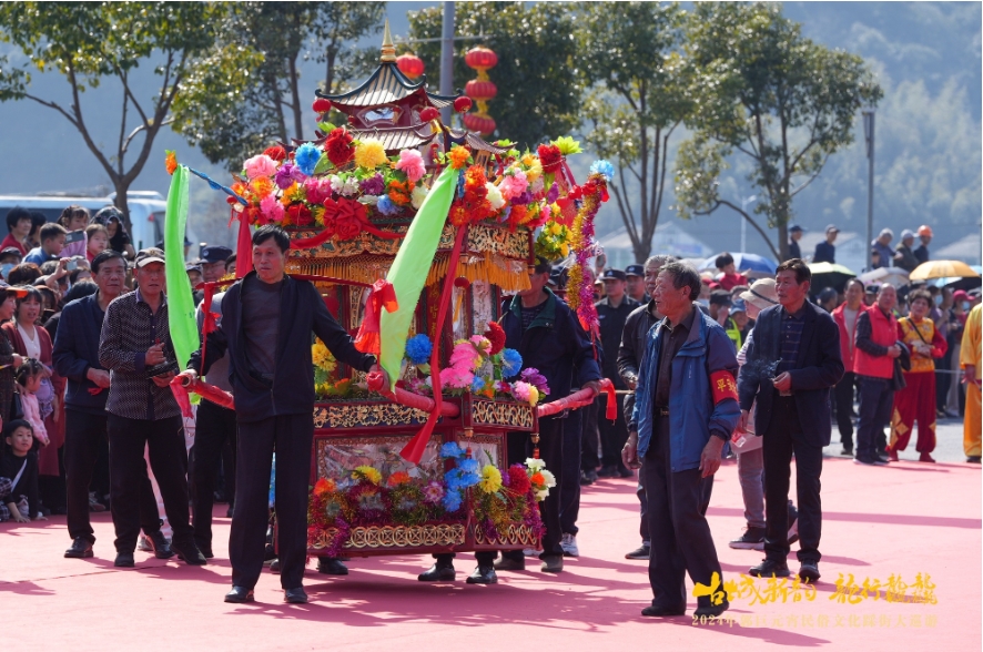 有一支特殊的隊伍格外引人注目——八名身強力壯的村民抬著一臺特殊的“閣樓”,閣樓上立有幾個身著鮮艷古代戲劇服裝的人偶?!疤чw也被稱為‘流動的戲臺’,郭巨抬閣迄今已有300多年歷史。多年來,當地人們一直用抬閣祈福,希望國泰民安、風調雨順?!惫尢чw非遺傳承人趙其立向游客介紹著抬閣,郭巨抬閣集歷史故事、神話傳奇于一體,融舞蹈、繪畫、戲曲雜技等藝術為一身,充分展示了郭巨民間藝術的豐富多彩。