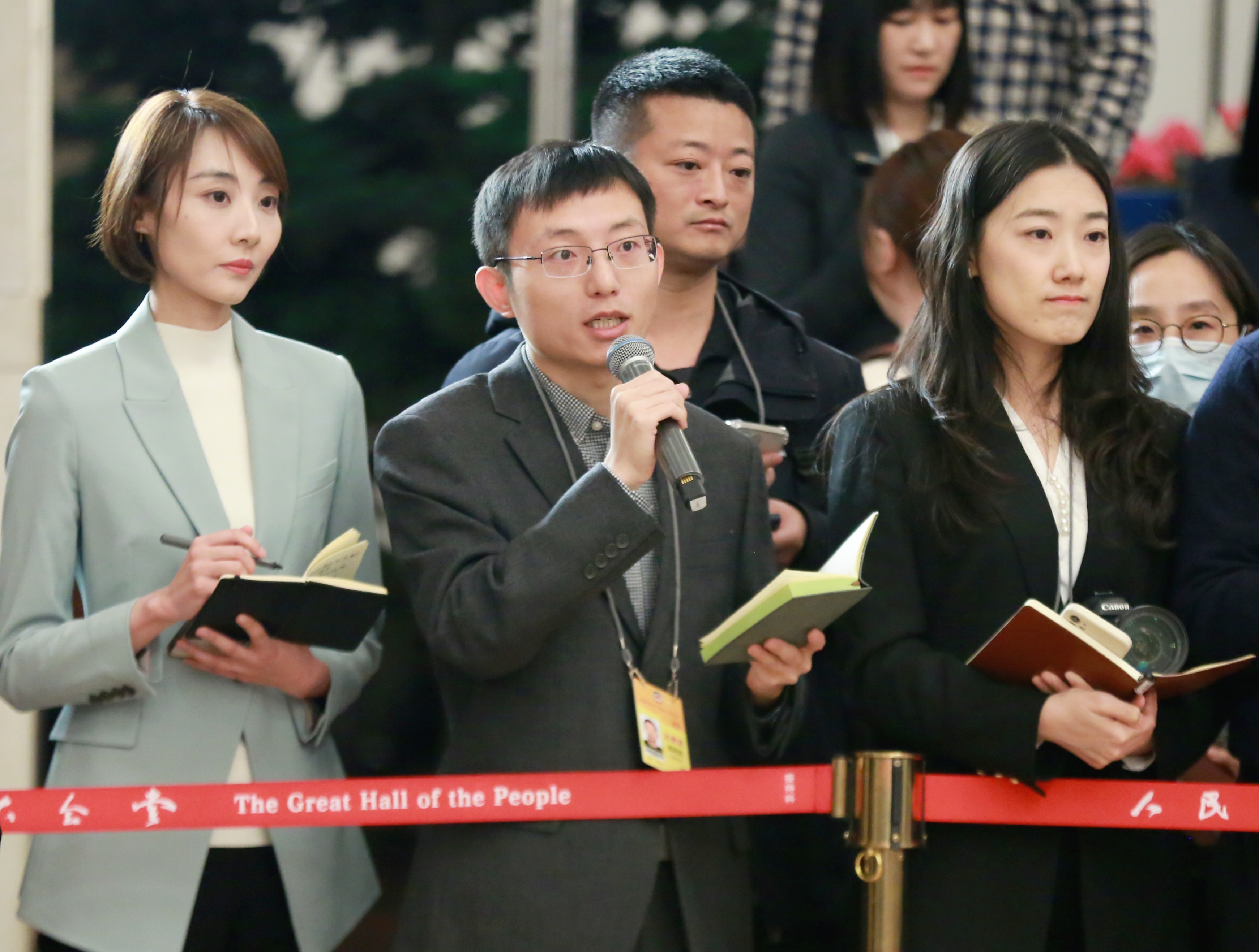 全國政協(xié)十四屆二次會(huì)議3月4日舉行首場(chǎng)“委員通道”采訪活動(dòng)。圖為本報(bào)記者提問。 本報(bào)記者 徐偉倫 攝