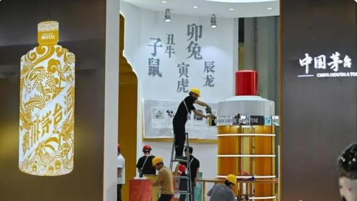 4月10日,第四屆中國國際消費(fèi)品博覽會(huì)參展物品陸續(xù)上架。圖為茅臺(tái)展位的工作人員進(jìn)行收尾施工。中新社記者 駱云飛 攝