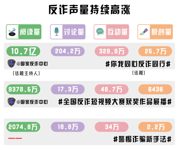 從微博數(shù)據(jù)來看,#你我同心反詐同行# #全國反詐短視頻大賽獲獎作品展播# #警惕詐騙新手法#等微博話題累計閱讀量超11.8億,輿論反響熱烈,反詐聲量持續(xù)高漲。