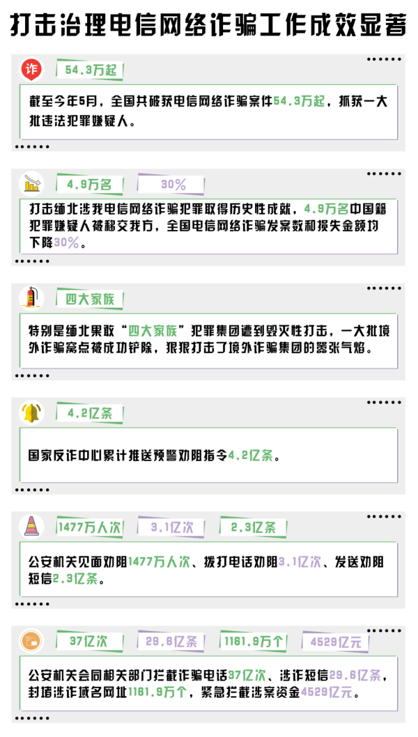 2023年以來,在黨中央的堅強領(lǐng)導(dǎo)下,各地各部門牢固樹立以人民為中心的發(fā)展思想,深入貫徹落實《中華人民共和國反電信網(wǎng)絡(luò)詐騙法》,深化運用“四專兩合力”總體思路,全力推進打防管控建各項措施,打擊治理工作取得明顯成效。