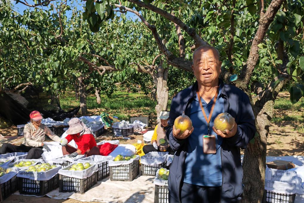 今年78歲的閆云海從20世紀80年代開始種梨,蜜梨、酥梨等品種試了個遍,最后找到梨果專家引進了玉露香梨?!坝衤断憷嫠执蟆⑻嵌?、色美、皮薄、口感好,而且耐保存。如今我們家三代人都在種玉露香梨?!遍Z云海說。