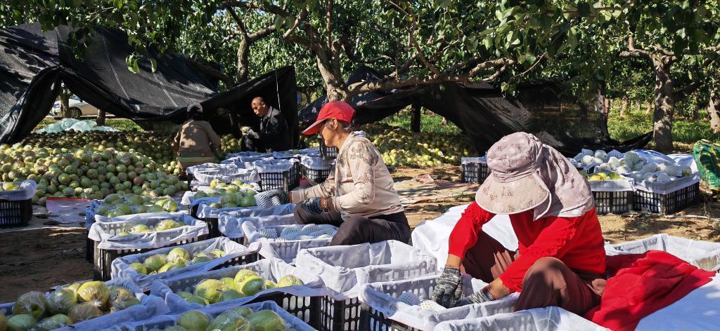 又到一年豐收時。近日,山西省臨汾市隰縣的玉露香梨迎來收獲季節(jié),沉甸甸的玉露香梨掛滿了枝頭。果農(nóng)們把玉露香梨從樹上摘下后,小心翼翼地放入筐中,分揀、包裝、裝車,果園里一派繁忙景象。