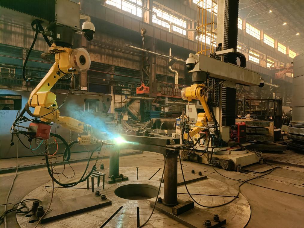 在哈電集團哈爾濱電機廠有限責任公司冷作分廠,藍色的弧光在焊花飛濺中“狂舞”,冰冷與熾熱交織在一起,自動焊接機器人在巨大的廠房內(nèi)“忙碌”……