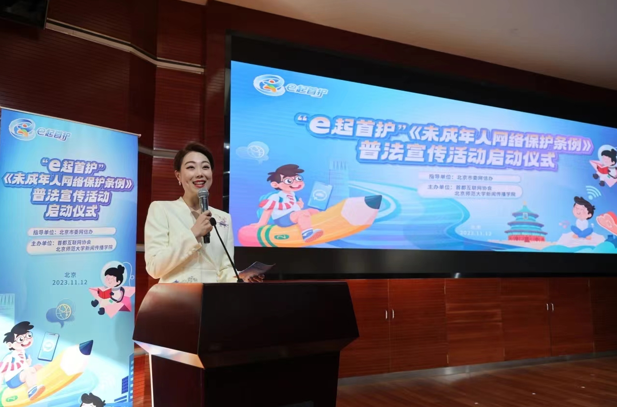 2023年11月12日,由北京市委網(wǎng)信辦指導(dǎo)、首都互聯(lián)網(wǎng)協(xié)會和北京師范大學(xué)新聞傳播學(xué)院主辦的“e起首護(hù)”《未成年人網(wǎng)絡(luò)保護(hù)條例》普法宣傳活動啟動儀式在北京師范大學(xué)舉行,這標(biāo)志著“e起首護(hù)”《未成年人網(wǎng)絡(luò)保護(hù)條例》(以下簡稱《條例》)系列普法活動正式拉開帷幕。中央網(wǎng)信辦網(wǎng)絡(luò)法治局副局長、一級巡視員侯云灝,北京市委網(wǎng)信辦副主任李德剛,北京師范大學(xué)校務(wù)委員會副主任陳光巨參加活動儀式并致辭。北京市委宣傳部、市高級人民法院、市人民檢察院、市教委、共青團(tuán)北京市委和各區(qū)委網(wǎng)信辦等相關(guān)負(fù)責(zé)同志,屬地重點(diǎn)互聯(lián)網(wǎng)企業(yè)、北京師范大學(xué)師生代表及社會各界人士200余人參加。