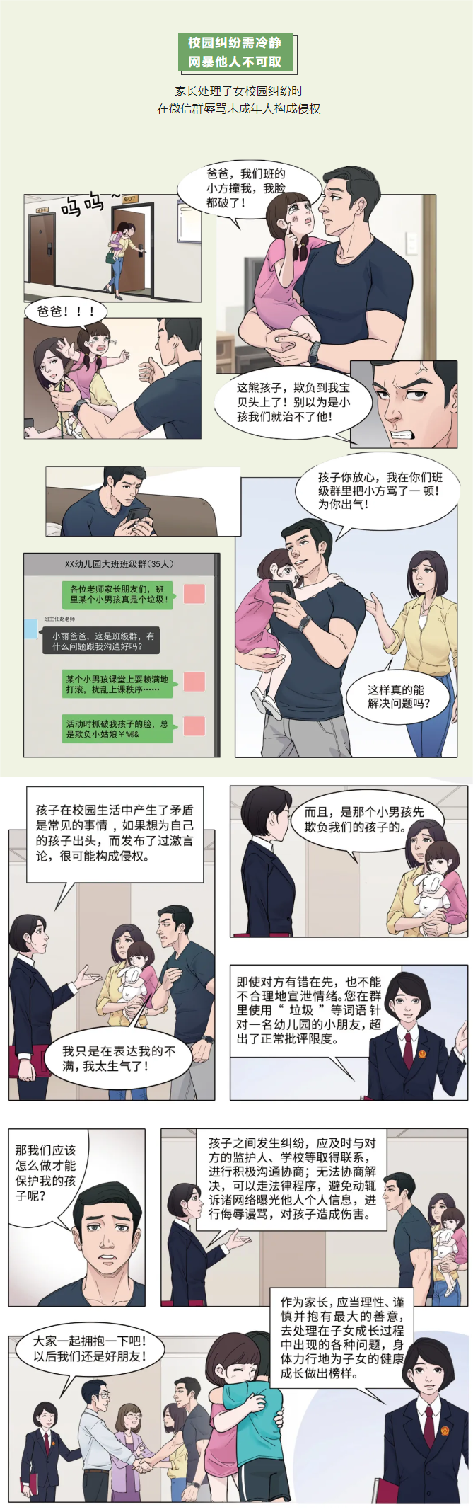 本案針對(duì)互聯(lián)網(wǎng)時(shí)代校園糾紛的線上化明確了行為邊界。兒童的身心尚未成熟,需要國(guó)家、家庭、學(xué)校、社會(huì)特殊的保護(hù)和照料。幼兒園是學(xué)齡前兒童除家庭之外最重要的生活學(xué)習(xí)場(chǎng)所,對(duì)于幼兒園同學(xué)之間產(chǎn)生的糾紛,家長(zhǎng)應(yīng)在充分理解兒童成長(zhǎng)規(guī)律和身心特點(diǎn)的基礎(chǔ)之上理性對(duì)待、謹(jǐn)慎處理,不能生硬地套用成年人的標(biāo)準(zhǔn)判斷、評(píng)價(jià)其行為動(dòng)機(jī)和邏輯,在充分了解事實(shí)的基礎(chǔ)上采取合理的溝通方式,避免因糾紛處理不當(dāng)對(duì)未成年人帶來(lái)次生傷害。