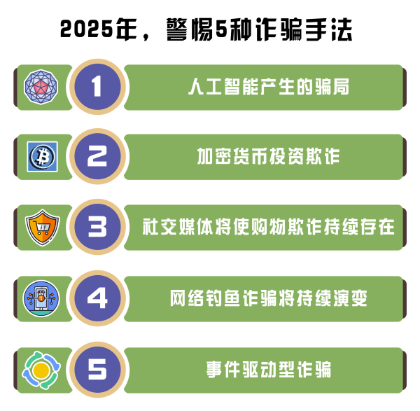 根據(jù)數(shù)據(jù)服務(wù)提供商scamadviser發(fā)布的一篇報(bào)告顯示,2025年,大家需要警惕人工智能產(chǎn)生的詐騙、加密貨幣投資詐騙、社交媒體下的購物欺詐、網(wǎng)絡(luò)釣魚詐騙、事件驅(qū)動(dòng)詐騙等五種詐騙手法。