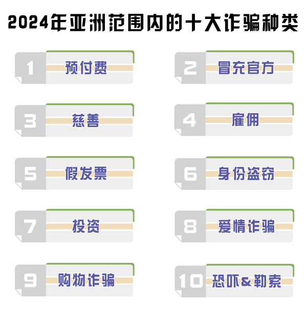 根據(jù)《2024年亞洲詐騙報(bào)告》,統(tǒng)計(jì)2024年亞洲范圍內(nèi)13個(gè)國家及地區(qū)詐騙種類前三名,計(jì)算后得出,身份盜竊、投資詐騙、購物詐騙成為出現(xiàn)頻率最高的詐騙類型,占比均為23.08%。此外,冒充官方、政府機(jī)關(guān)人員實(shí)施詐騙占比達(dá)到10.26%,同樣需要引起重視。