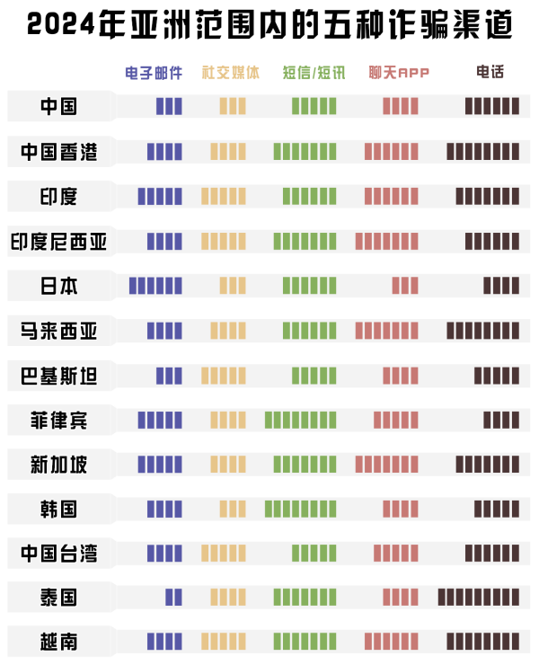 從GASA發(fā)布的《2024年亞洲詐騙報(bào)告》來看,在13個(gè)國家及地區(qū)中,犯罪分子實(shí)施詐騙的渠道通常有如下五種:電子郵件、社交媒體、短信及短訊、聊天APP、電話。