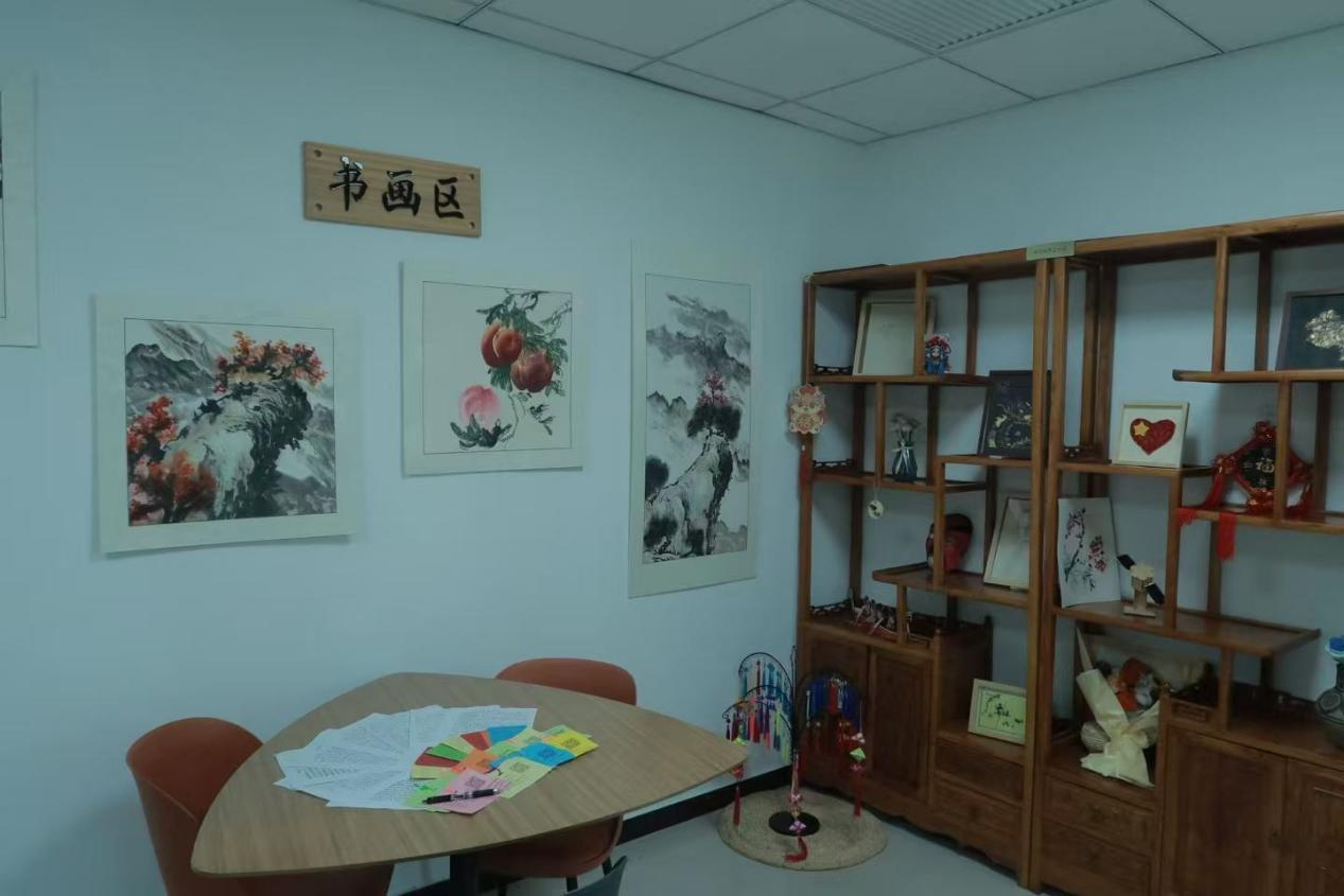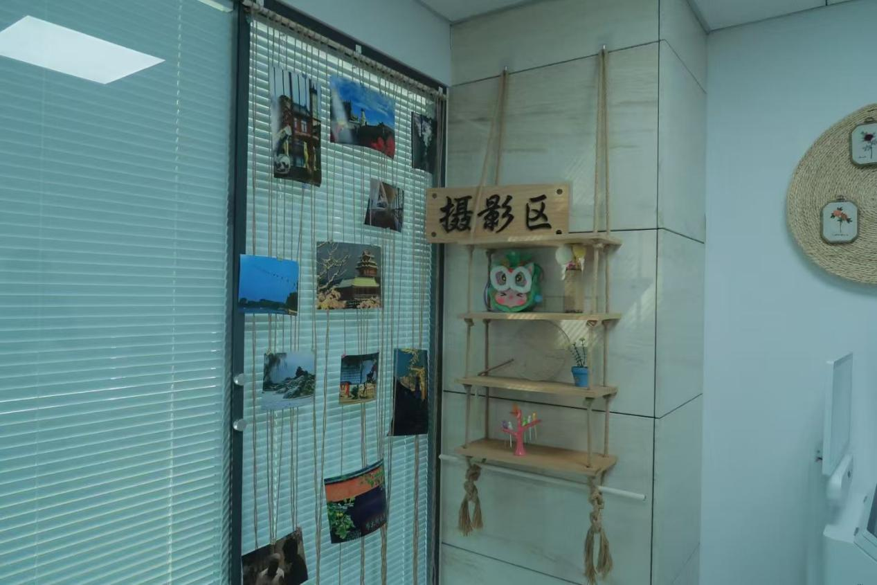 穿過矯正中心的走廊,有一間技能培訓室,里面擺滿了社區(qū)矯正對象學習制作的各類手工、繪畫、攝影作品,這里是為矯正人員提供知識技能培訓的場所。