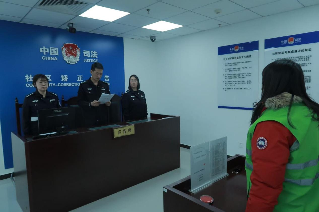 比起心理咨詢室里的溫情,在另外一間“宣告室”內(nèi),氣氛則明顯莊嚴。中午十二點十分,選派監(jiān)獄(戒毒)警察參與社區(qū)矯正工作的趙奎向入矯對象嚴肅地宣讀相關(guān)規(guī)定:“在社區(qū)矯正期間應(yīng)當遵守法律法規(guī),服從監(jiān)管,接受教育……”這是入矯對象在社區(qū)矯正中心的最后一個環(huán)節(jié)。