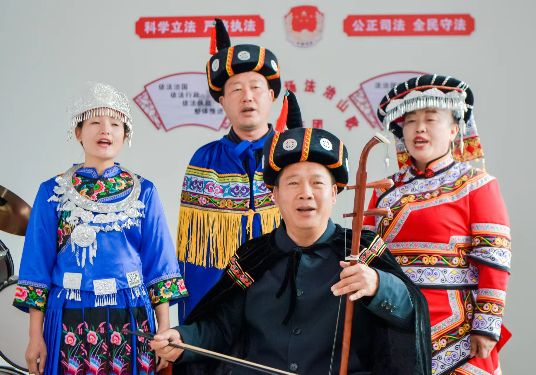 去年盛夏的榕江“村超”賽場,侗族琵琶歌《反詐勸世歌》引發(fā)萬人合唱。當(dāng)?shù)厮痉ň盅垏壹壏沁z傳承人吳家興,將38部法律改編成72首侗族大歌,通過“賽前普法微課堂+賽中法治啦啦隊”模式,讓20萬游客在“最炫民族風(fēng)”中完成法治教育。