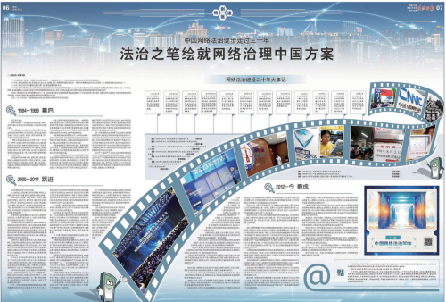 協(xié)調重要報道力量,采寫《中國網絡法治健步走過三十年法治之筆繪就網絡治理中國方案》報紙專版稿件,采用通版對開形式呈現(xiàn)。綜述文章雋永厚重,版面視覺效果恢弘大氣,圖文并茂地對《中國網絡法治三十年》報告進行了全面解讀,獲得全網廣泛傳播。在該專版中,既集納傳統(tǒng)的報紙通訊、記者手記等文字報道,又運用多種媒體元素、創(chuàng)新設計報紙版式。橫跨全版的“時光膠卷”一氣呵成,讓網絡法治建設三十年大事記躍然紙上。同時,放置新媒體“門票”海報,讓讀者沉浸式體驗網絡法治建設的歷史成就。