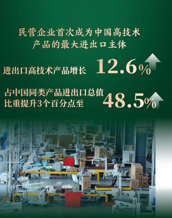 民營企業(yè)首次成為中國高技術(shù)產(chǎn)品的最大進(jìn)出口主體,進(jìn)出口高技術(shù)產(chǎn)品增長12.6%,占中國同類產(chǎn)品進(jìn)出口總值比重提升3個(gè)百分點(diǎn)至48.5%。
