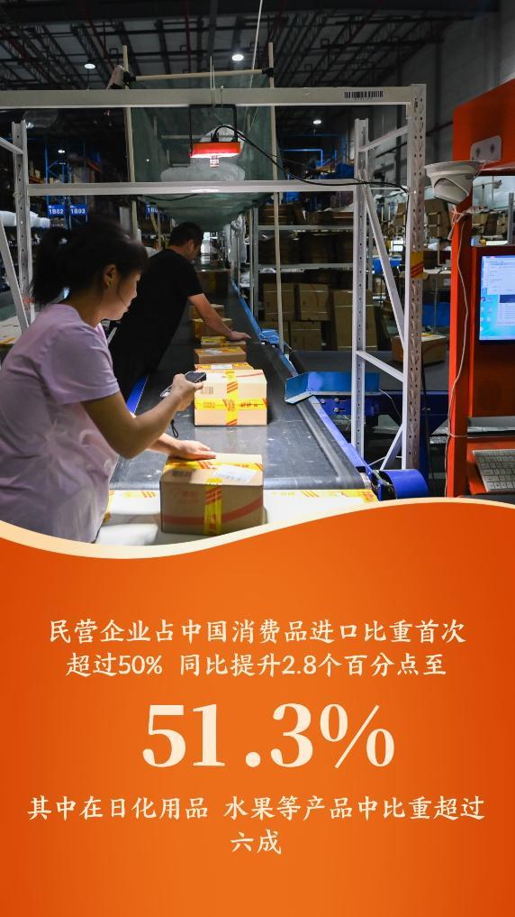 民營企業(yè)占我國消費(fèi)品進(jìn)口比重首次超過50%,同比提升2.8個(gè)百分點(diǎn)至51.3%,其中在日化用品、水果等產(chǎn)品中比重超過六成。