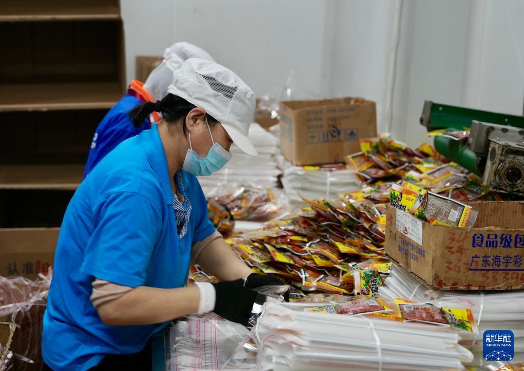 4月8日,在沈陽市陽陽食品有限公司,工人將辣條打包裝箱。