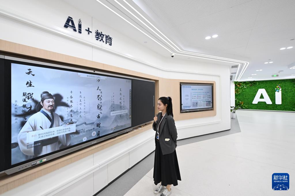 在科大訊飛天津公司,工作人員展示用于教育領域的AI產品(4月18日攝)。