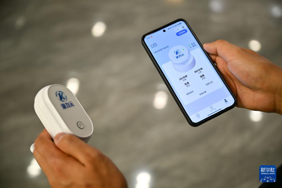 在天津小橙集團有限公司,工作人員展示一款聯(lián)網(wǎng)可查看的毫米波體征監(jiān)測儀(4月18日攝)。