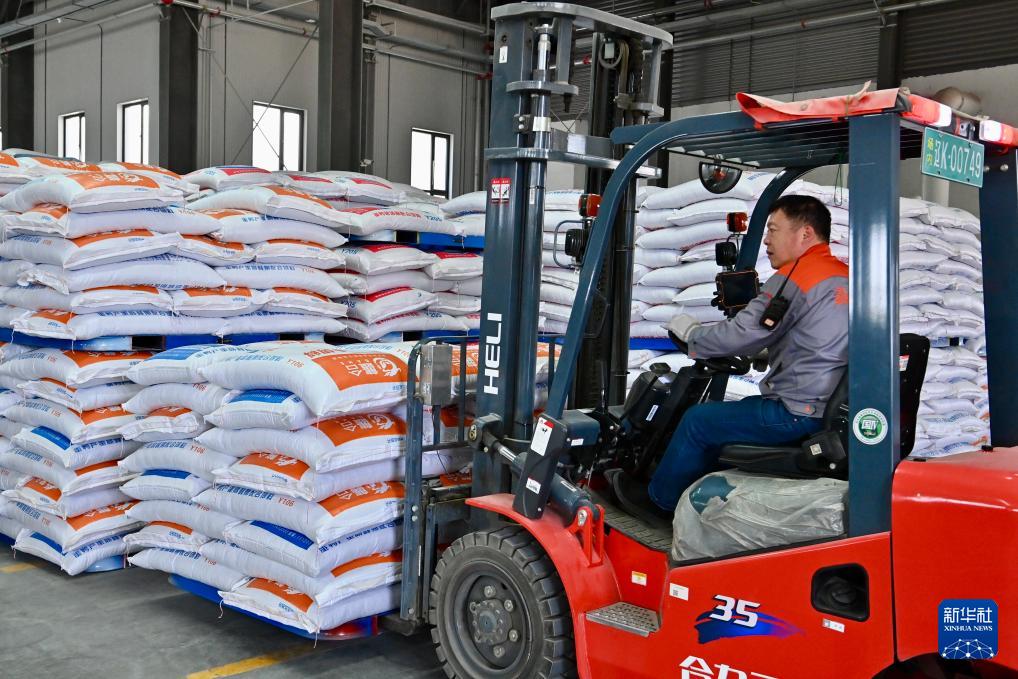4月24日,在位于遼陽市的遼寧鑫金科技實業(yè)集團有限公司的飼料廠內(nèi),工人使用叉車搬運飼料。