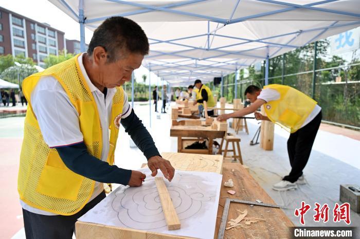 5月22日,西北四省(區(qū))文物保護(hù)工匠技能競賽暨甘肅省第一屆文物行業(yè)職業(yè)技能競賽在甘肅蘭州舉行。圖為參賽選手沈明三進(jìn)行木作文物修復(fù)競賽項(xiàng)目。九美旦增 攝