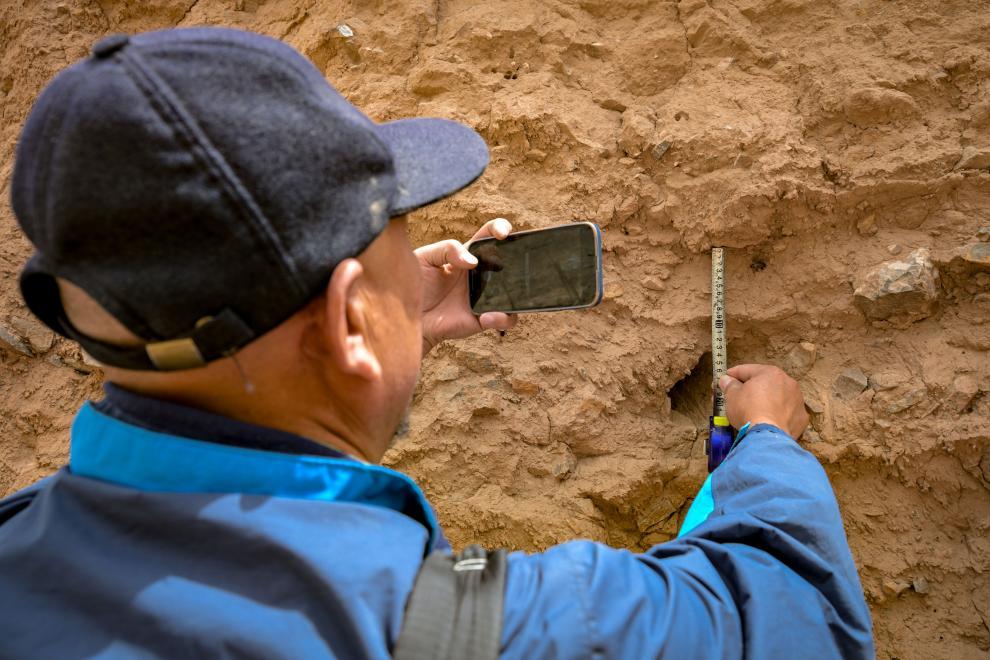 5月13日,李世翔在黃河黑山峽考察途中測(cè)量一處秦長(zhǎng)城夯土層。