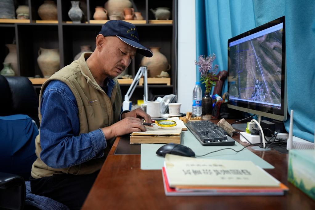 5月12日,李世翔在工作室參考古籍,標(biāo)記他實(shí)地考察的一處古城遺址。