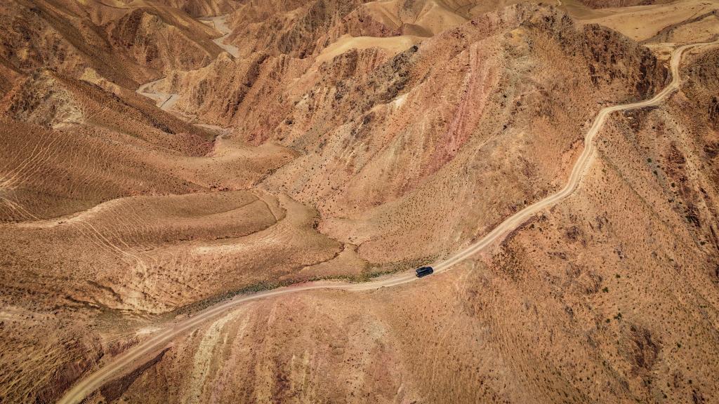 5月13日,李世翔駕車前往黃河黑山峽考察途中經(jīng)過一段崎嶇的山路(無人機(jī)照片)。