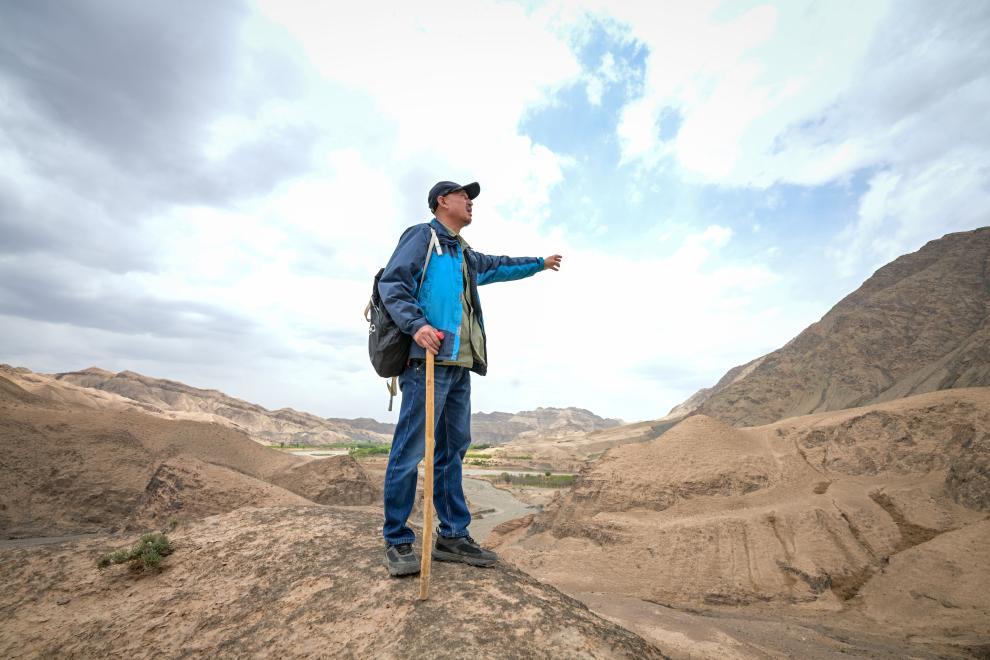 5月13日,李世翔在黃河黑山峽考察途中,站在一處秦兵營(yíng)遺址上遙指對(duì)面山上的長(zhǎng)城。