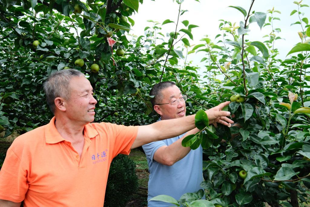 莫日發(fā)(右)在梨園檢查梨子長勢。新華社記者 鄒雨沁 攝