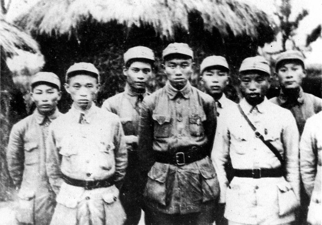 這是1939年初,新四軍第一支隊(duì)二團(tuán)部分干部在茅山的合影。左起第五位為蕭國生(資料照片)。新華社發(fā)