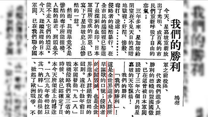 1945年9月9日出版的《星洲日報》與《總匯報》聯(lián)合版刊登《我們的勝利》的文章。圖片來源:新加坡國立大學(xué)官網(wǎng)