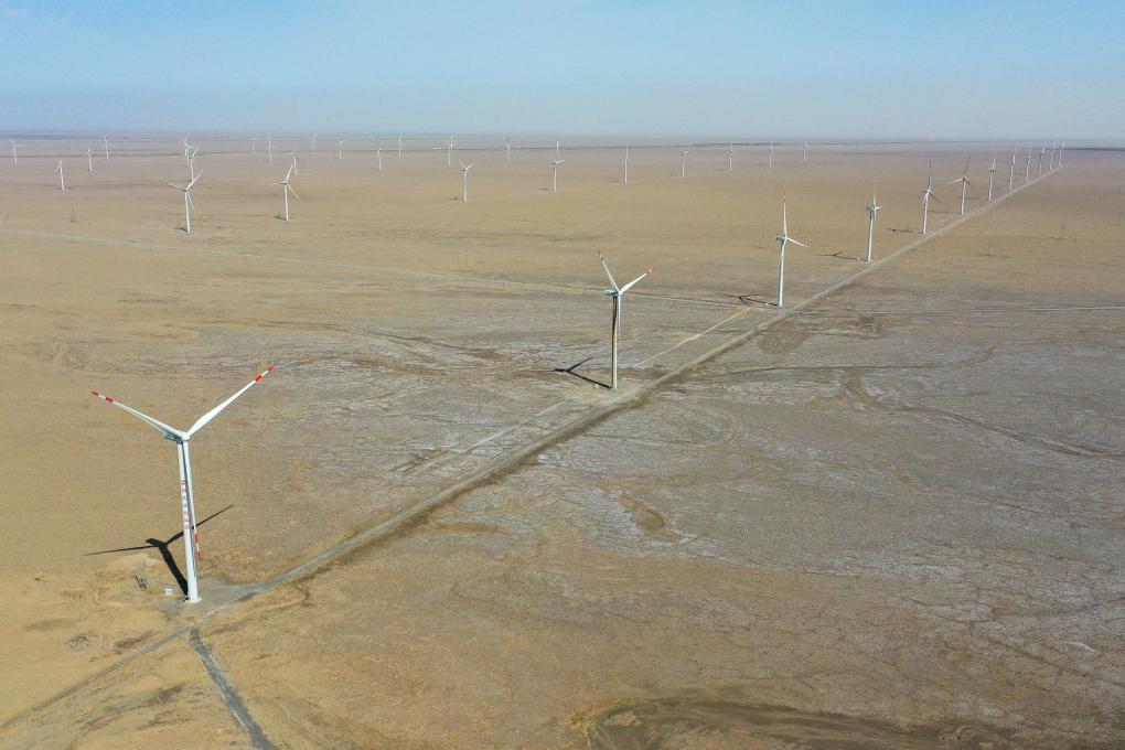 這是在新疆巴音郭楞蒙古自治州若羌縣拍攝的新天綠色能源股份有限公司新天若羌縣羅布莊10萬千瓦風(fēng)電項目(6月27日攝,無人機(jī)照片)。新華社記者 丁磊 攝