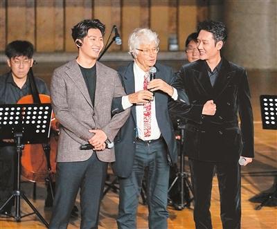 電影《狼圖騰》導(dǎo)演讓-雅克·阿諾(前排左二)與中國(guó)演員馮紹峰(前排右一)、竇驍在“光影百年·中法同行”電影音樂(lè)會(huì)上互動(dòng)。 新華社記者 謝晗攝
