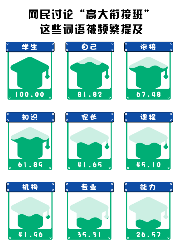 (數(shù)據(jù)來(lái)源:選取知乎話(huà)題“培訓(xùn)機(jī)構(gòu)推出‘高大銜接班’,為大一新生補(bǔ)習(xí)大學(xué)知識(shí),暑假補(bǔ)課真能‘贏(yíng)在大學(xué)起跑線(xiàn)’嗎?”下的172個(gè)回答,做分詞及歸一化處理,進(jìn)行分詞后將熱度最高的詞語(yǔ)規(guī)定為100)