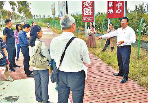 張家祥(右一)向來張河村考察的相關(guān)人員介紹本村產(chǎn)業(yè)發(fā)展特色